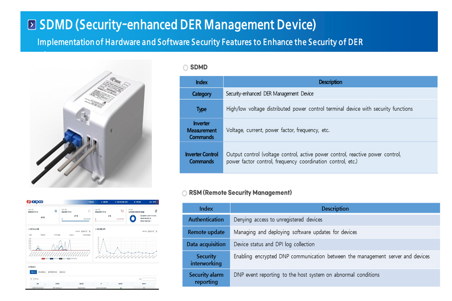 Existing DER gateways were designed for remote monitoring and control of inverters, but lack dedicated security features. To counter the risk of cyberattacks via the internet, it's necessary to implement separate cybersecurity facilities and detection systems. It creates a significant cost burden for both grid operators and power generation companies. The Security-enhanced DER Monitoring Device (SDMD) addresses this issue. It detects and blocks data tampering between internet-connected power generation resources and the grid with 99.9% accuracy. Furthermore, it uses strong, hardware-based authentication to prevent unauthorized devices from connecting with 100% certainty. By strengthening the security of distributed energy systems, the SDMD helps prevent large-scale blackouts caused by cyberattacks. This product not only addresses the security vulnerabilities in the rapidly growing renewable energy infrastructure but also plays a key role in building a reliable national energy grid and achieving carbon neutrality goals.